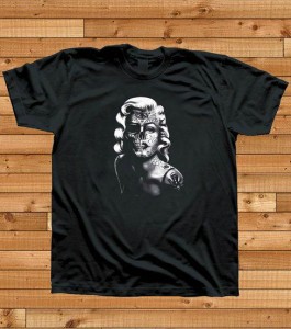 What was she wearing? “I did snag the only piece of rainbow jewelry I’ll ever wear – because it’s comprised of six different colored skulls,” Buchanan said, and “I wore my trademark black cowboy hat with its skull band and ‘genderqueer’ button. Otherwise, it was my Calaveras-Marilyn Monroe t-shirt (see below), jeans and my cowboy-cum-biker boots. As for after-parties, after the four hour drive and several hours in 105 degree heat, the biggest party I could muster was a shower, sushi and drop into bed—well, not right into bed *grin.*”